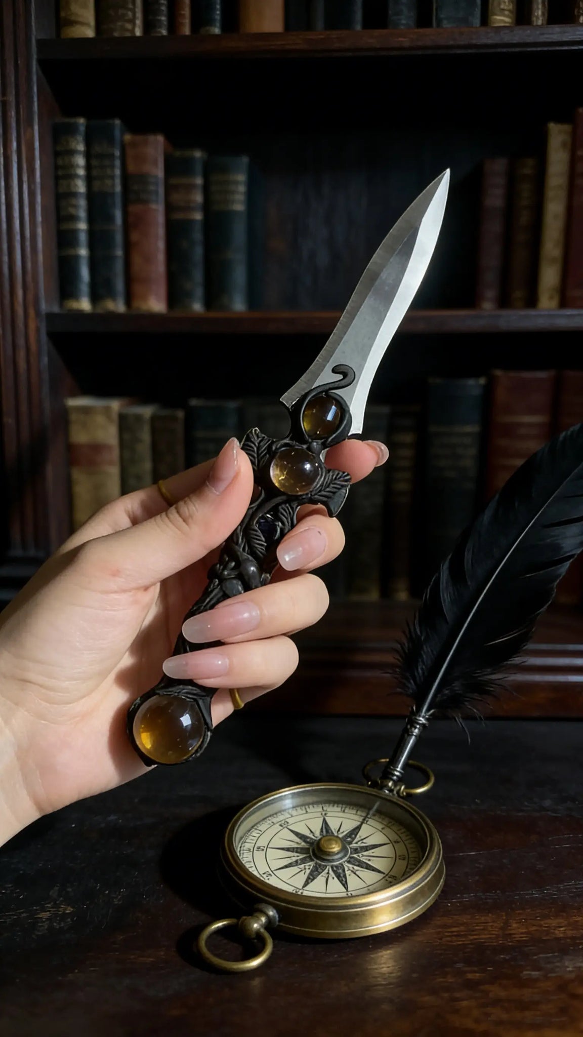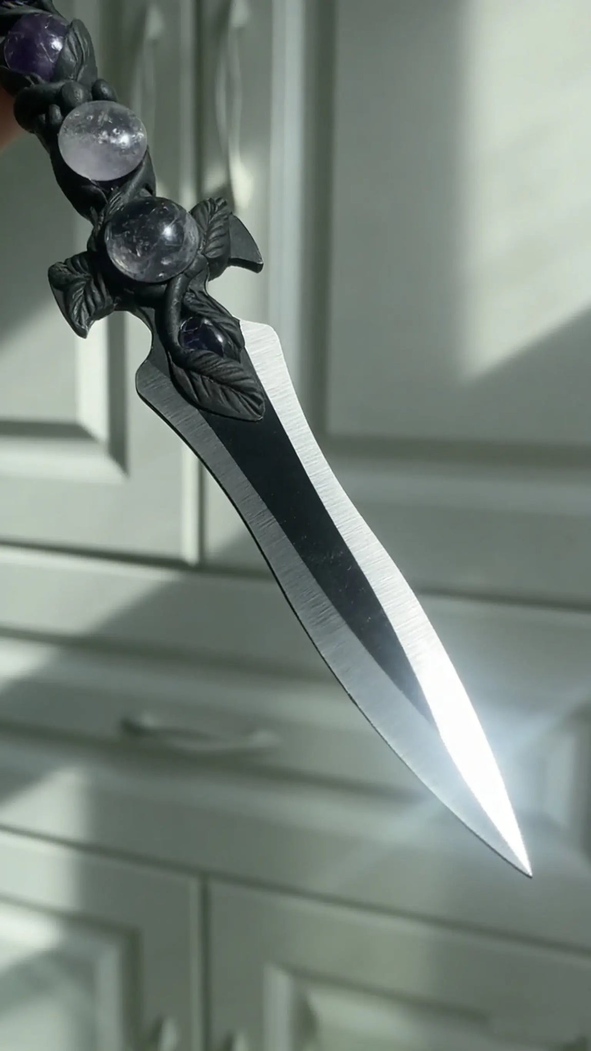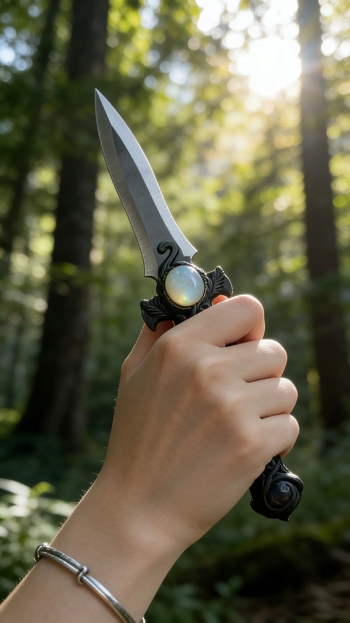 The Aura Blade Collection is crafted as ritual daggers for your spiritual journey, inspired by natural energy and ancient magic. Each piece merges the high-frequency vibration of crystals with hand-sculpted vine textures, serving as an energy anchor to connect with your inner divinity and elevate your ritual practice. 🔮 Product Details 1. Moonlight Shadow Dagger (Moonstone) Product Name: Moonlight Shadow Dagger · Intuition Awakening Ritual Blade Design Inspiration: Inspired by forest vines under a full moon, the winding texture mimics moonlight filtering through leaves. The adularescence of moonstone flows like liquid moonlight, designed to awaken inner intuition and balance emotional frequencies. Materials: 304 stainless steel blade (mirror polished), eco-resin handle with hand-sculpted vine texture, inlaid with natural moonstone and obsidian. Dimensions: Total length ~18cm, blade length ~7cm, handle diameter ~2.5cm. 2. Forest Wraith Dagger (Smoky Quartz) Product Name: Forest Wraith Dagger · Grounding Protection Ritual Blade Design Inspiration: Rooted in the ancient underground roots of old-growth forests, deep brown smoky quartz acts as a core of earth energy accumulated over millennia. The vine texture symbolizes the resilience of life, creating a stable grounding shield to dispel low-frequency energy. Materials: 304 stainless steel blade (matte brushed), eco-resin handle with hand-sculpted vine texture, inlaid with natural smoky quartz and pyrite. Dimensions: Total length ~17.5cm, blade length ~6.8cm, handle diameter ~2.4cm. 3. Stardust Spirit Dagger (Clear Quartz) Product Name: Stardust Spirit Dagger · High-Frequency Purification Ritual Blade Design Inspiration: Derived from the flow of cosmic stardust, transparent clear quartz embodies concentrated starlight, while the vine texture mimics the winding of star trails. Ideal for space purification and raising energy frequencies, it is a high-vibration companion for meditation and rituals. Materials: 304 stainless steel blade (mirror polished), eco-resin handle with hand-sculpted vine texture, inlaid with natural clear quartz and amethyst. Dimensions: Total length ~18.2cm, blade length ~7.2cm, handle diameter ~2.6cm. 🕯️ Usage Scenarios Spiritual Rituals: Use as an energy conduit for opening, cleansing, and protection ceremonies Space Purification: Place on altars or energy centers to stabilize space frequencies Meditation Aid: Hold the dagger to connect with crystal energy and deepen meditative states 📌 Important Note This product is a spiritual ritual tool, not a practical knife. Do not use for cutting or striking hard objects. Crystals are natural minerals, so slight variations in texture and color are normal and unique to each piece.